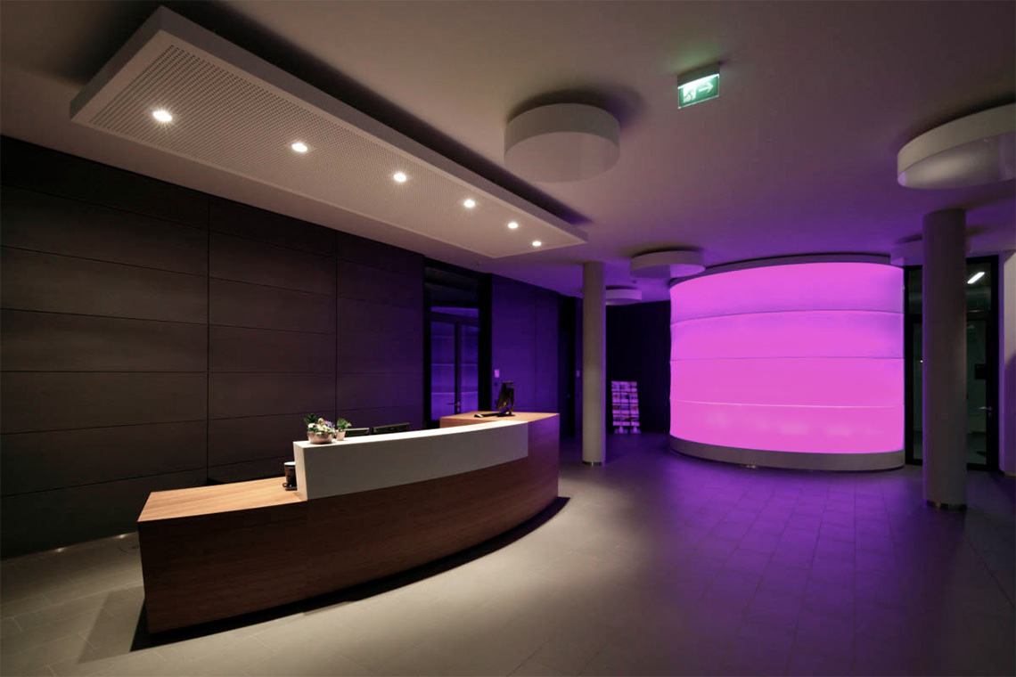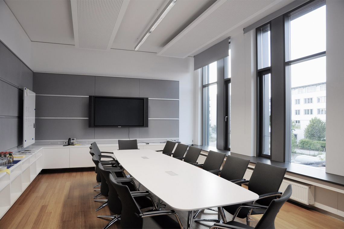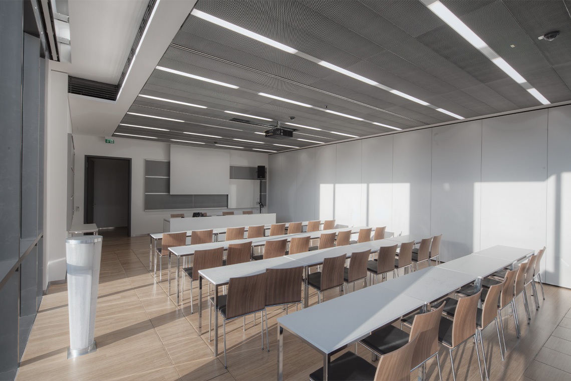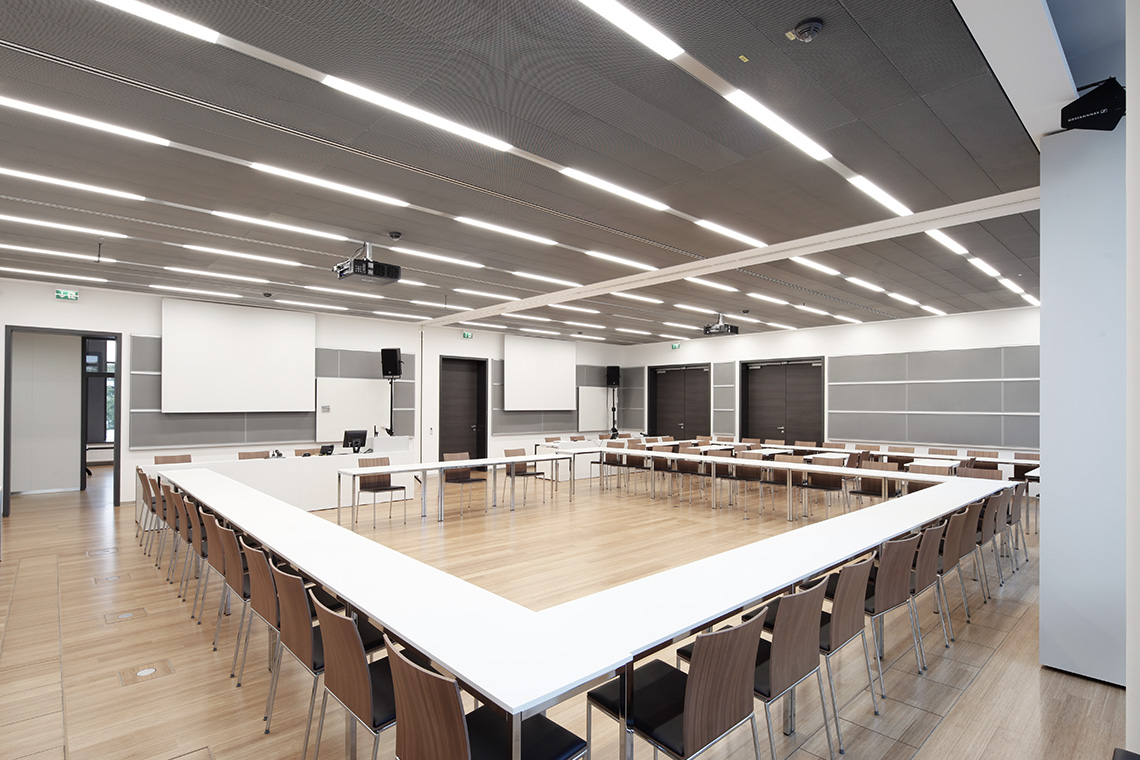 Durch den Neubau entsteht ein winkelförmiges Gebäudeensemble. So wird der Außenbereich neu definiert und qualitativ verbessert. Der Haupteingang liegt im großzügigen und hellen Foyerbereich mit Galerie, die zu den Seminar- und Besprechungsräumen führt. Der Neubau schließt mit einem witterungsgeschützten Durchgang an ein bestehendes Gebäude an.