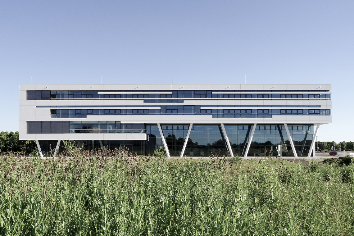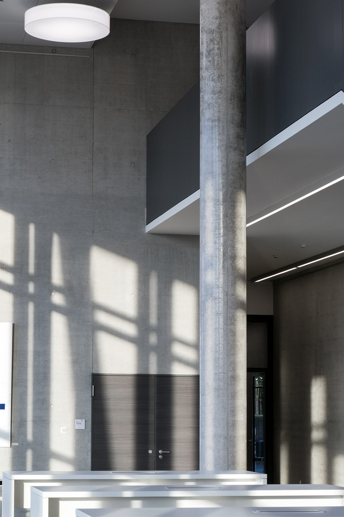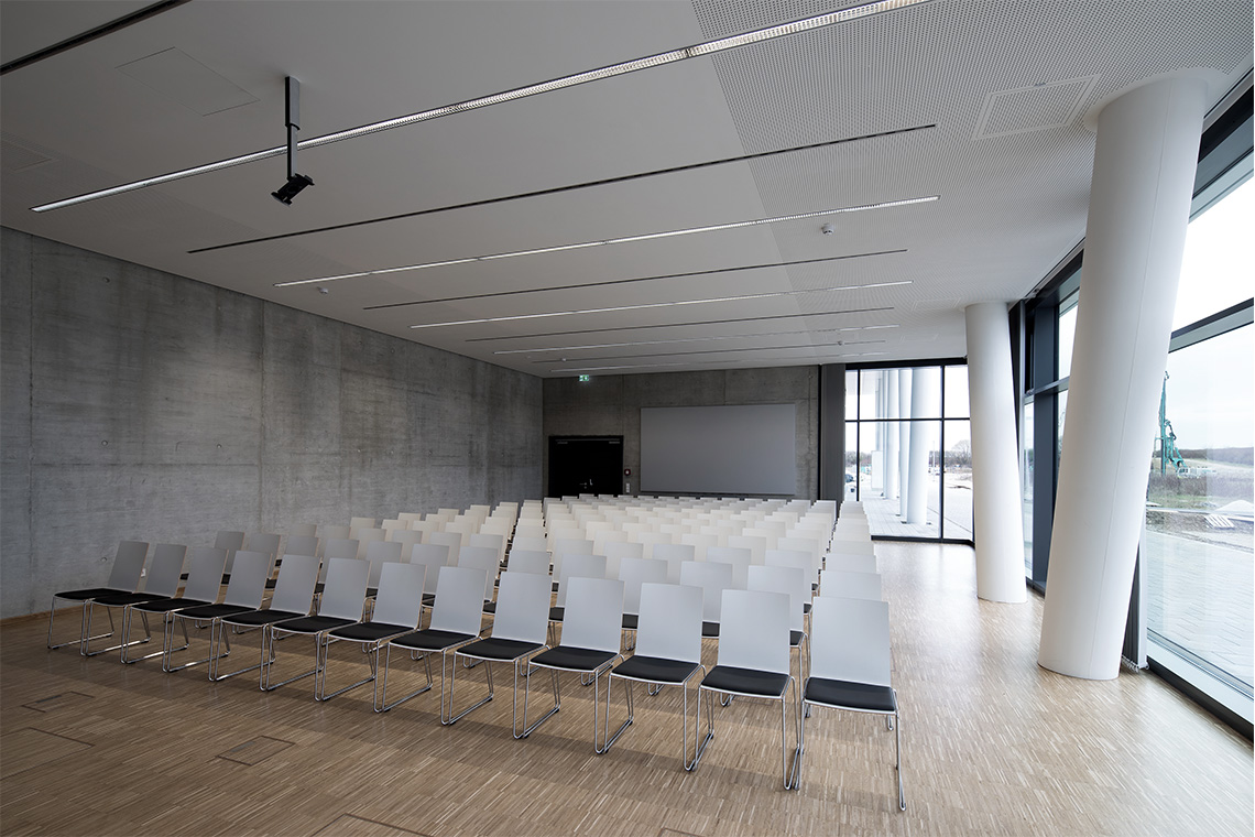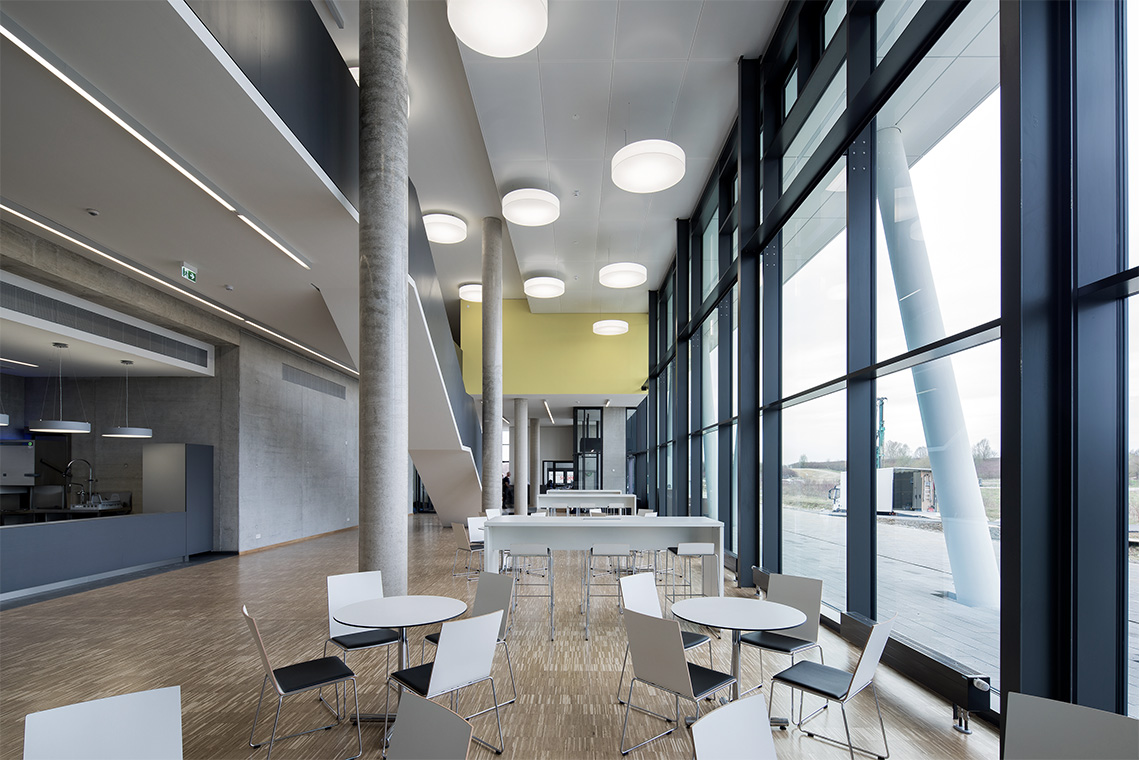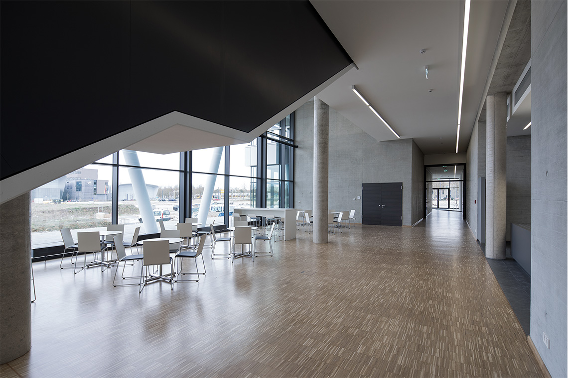 Um dies zu bewerkstelligen sieht das Grundkonzept des Baus einen multifunktionalen Kommunikationsbereich vor, der die Laborbereiche, Werkstätten, Büro- und Verwaltungsräume miteinander verbindet. Dies trägt zu einem kreativen und produktiven Miteinander bei.