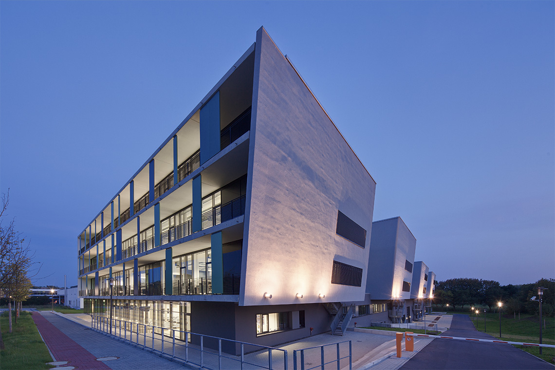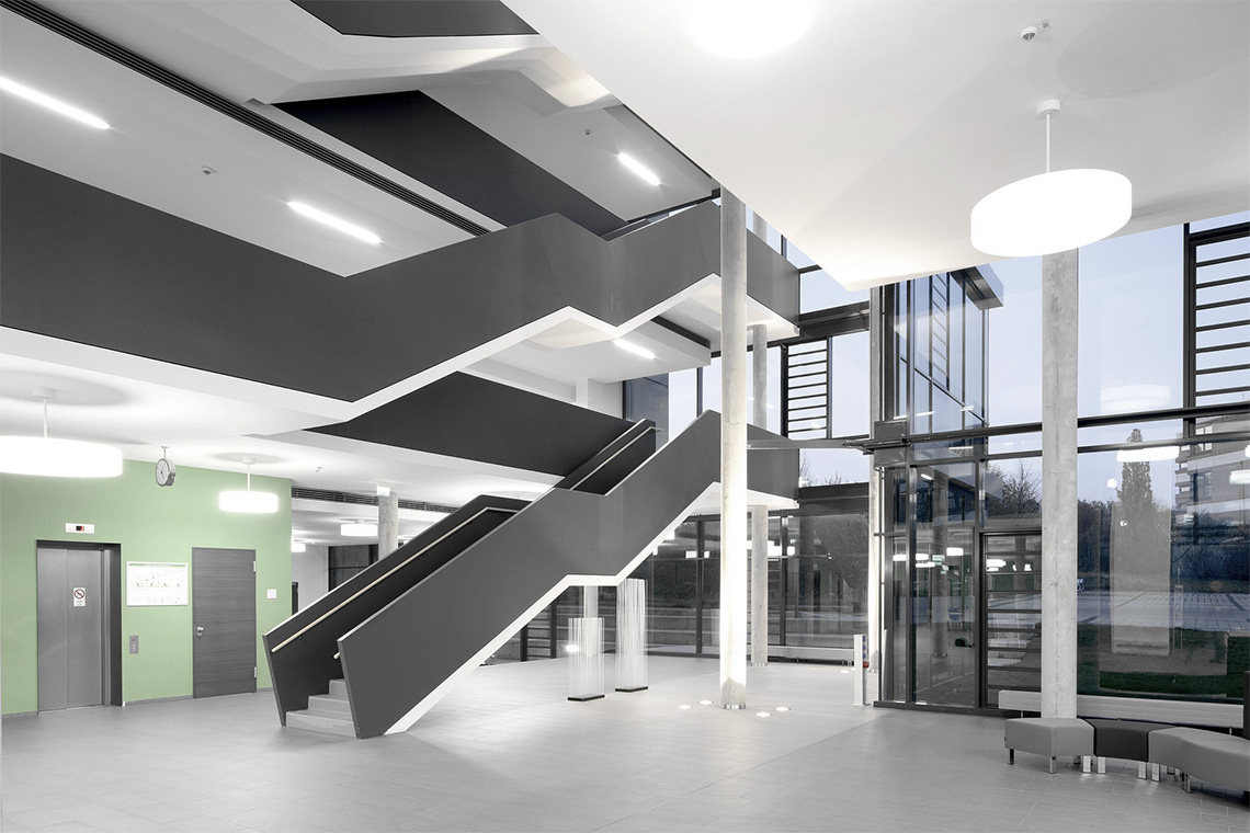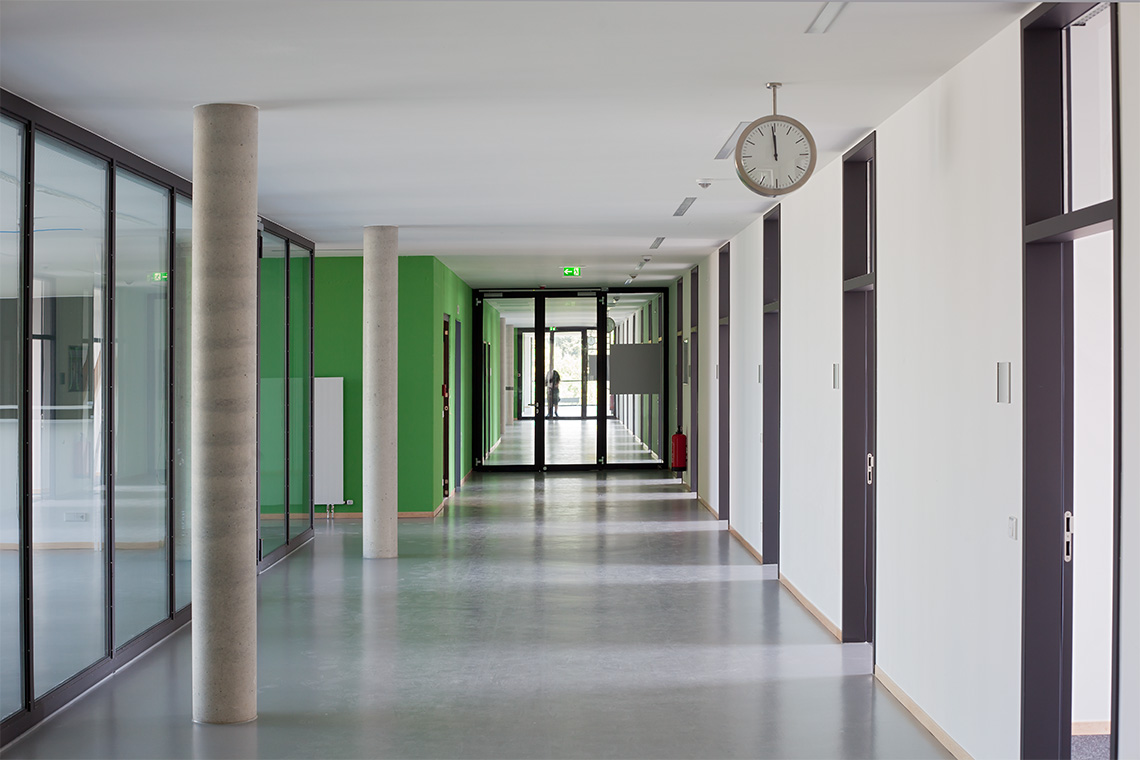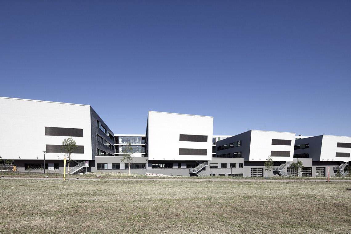 Dies wird durch eine Kammstruktur bewerkstelligt, die aus einem fünfgeschossigen Langbaukörper besteht, an dem westlich vier „Finger“ anschließen. Die architektonische Struktur des Baukörpers ermöglicht kurze Wege und spiegelt inhaltlich die Gliederung der einzelnen Fachbereiche. Die verglasten Flurwände ermöglichen, trotz der notwendigen kompakten Bauweise, tageslichtdurchflutete Flurzonen.