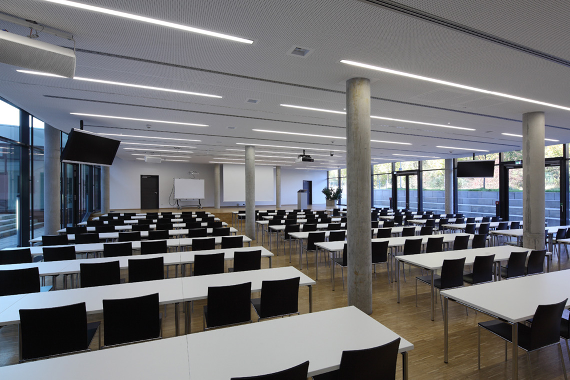 Die Aufgabenstellung beinhaltet die Schwierigkeit, unterschiedlichste Funktionsbereiche in einem relativ engen Baufeld unterzubringen.