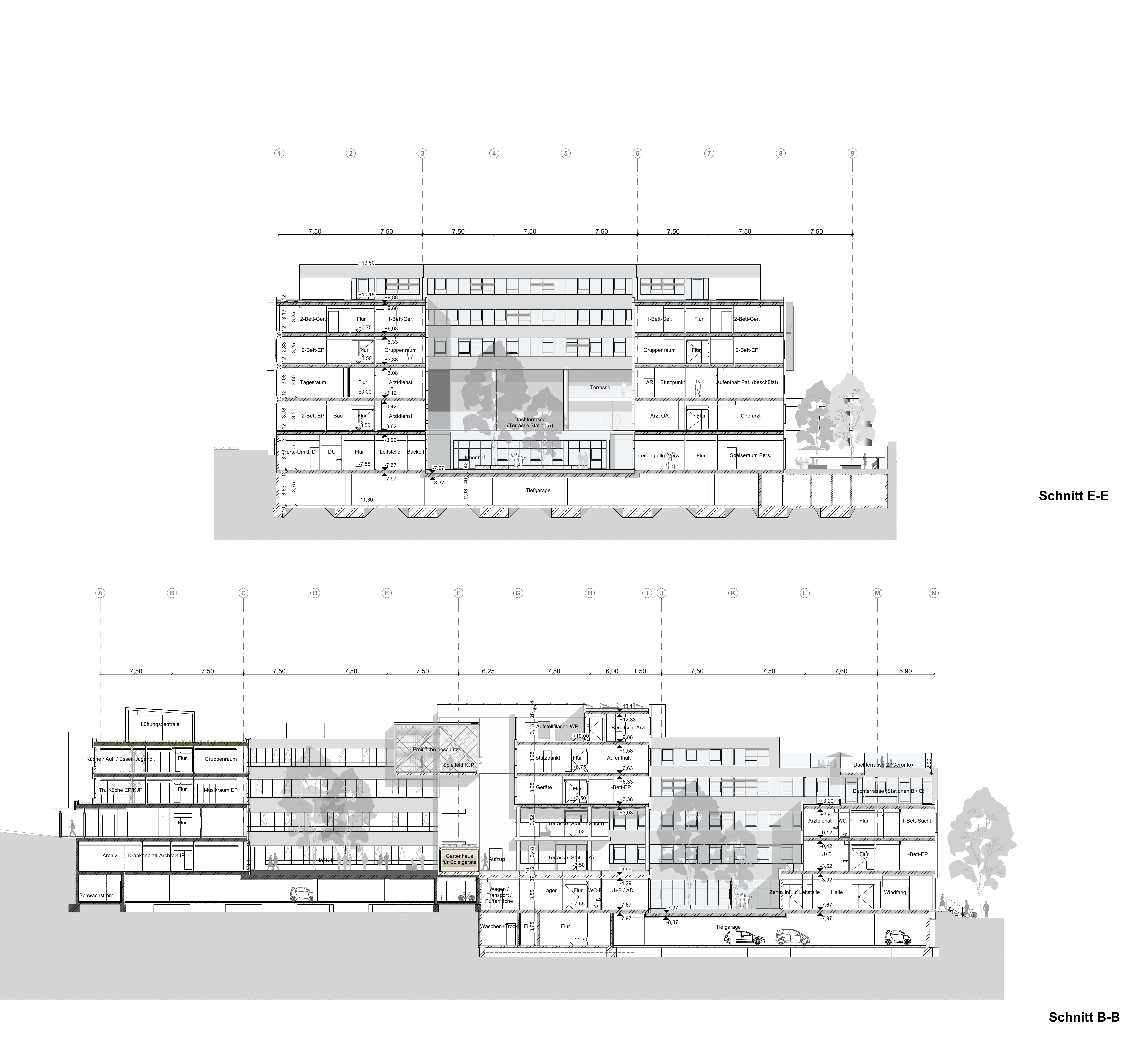 Darum erhält der Erweiterungsbau sieben Stockwerke und wird in Stahlbeton realisiert. Mit Dachgärten, Terrassen, Loggien, Innenhöfen und dergleichen erhalten alle Stationen Freibereiche. Die gut gedämmte Fassade wird mit einzelnen großen Fensterelementen oder mit durchgehenden Glasfronten versehen, um möglichst viel natürliches Licht ins Gebäude zu bringen. Einzelne Fassadenteile sollen begrünt werden. Der Neubau sowie das Bestandsgebäude sollen über vier Wärmepumpen beheizt werden. Zudem werden auf dem Dach Photovoltaikanlagen für Strom sorgen.