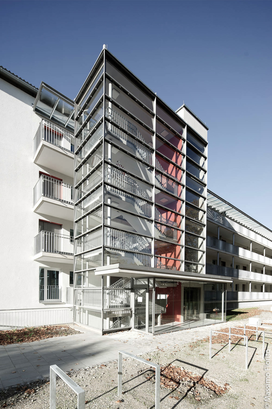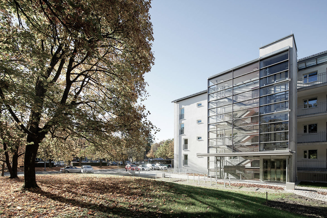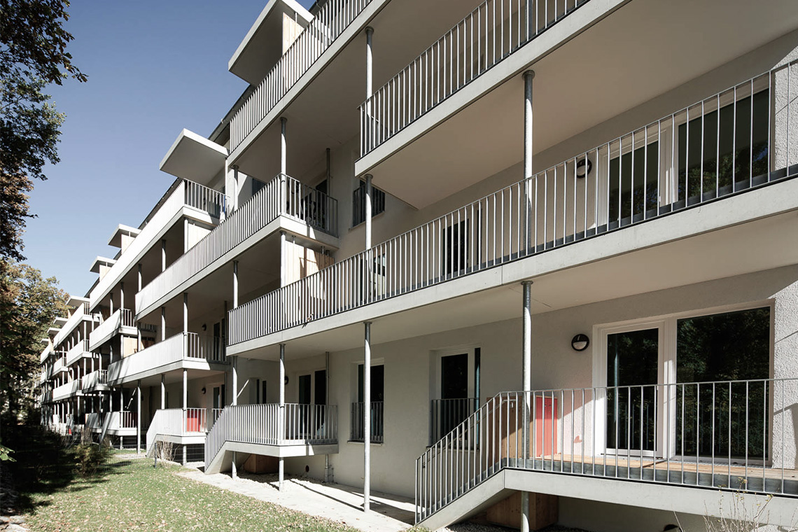 Schutzzäune und Wurzelvorhänge schützen die Natur in der Umgebung während der Bauarbeiten. Die Bestandstreppenhäuser werden abgebrochen und zu Wohnfläche umgewandelt. Der Wohnungszugang erfolgt nun über Laubengänge. Durch die Anhebung des Firstes wird ein drittes Vollgeschoss realisiert. So werden 17 zusätzliche Wohnungen geschaffen.