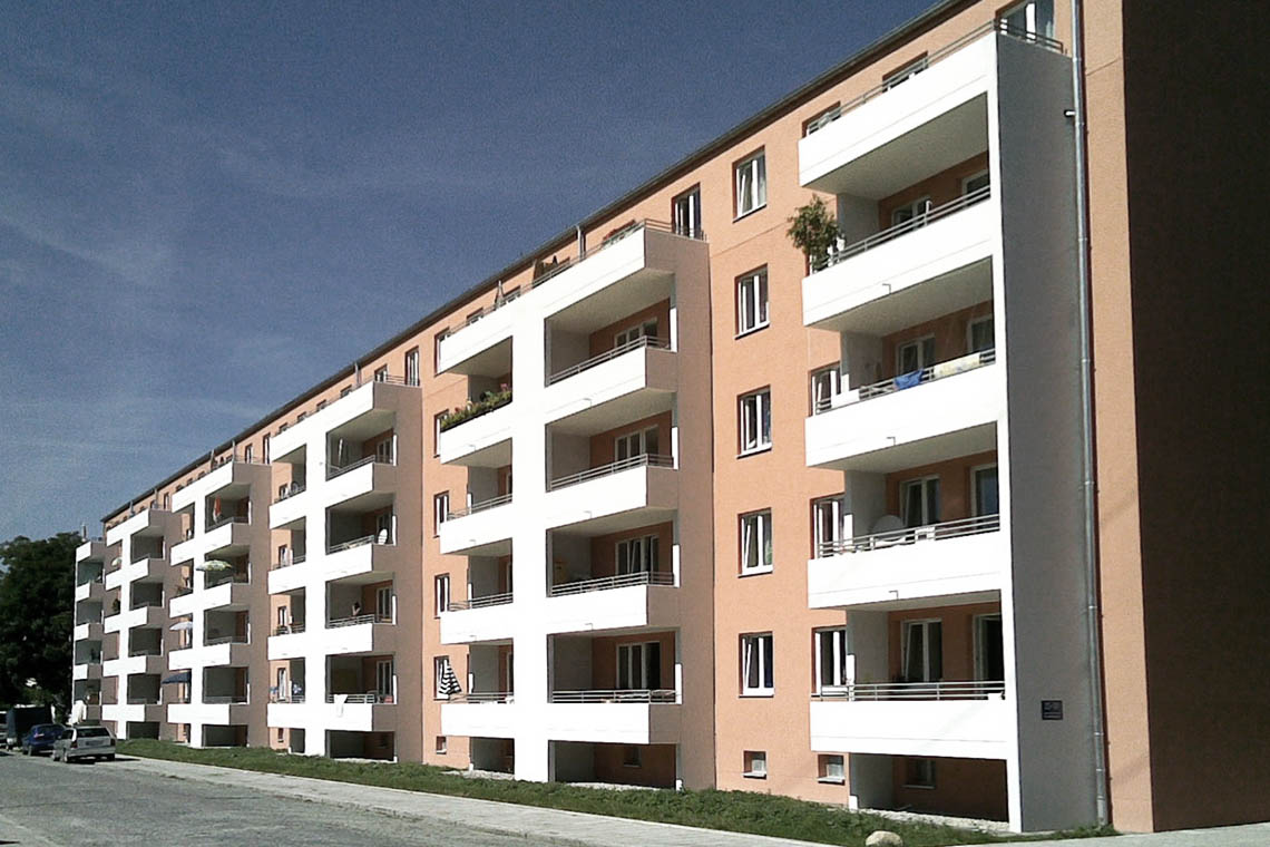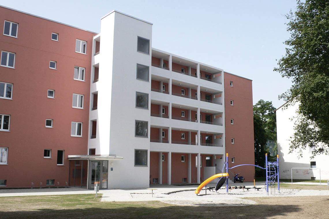 Drei der fünf Treppenhäuser werden abgerissen. Dafür erstrecken sich nun Laubengänge auf der Hofseite. Das bestehende Satteldach wird abgetragen, das Gebäude um ein weiteres Geschoss aufgestockt und mit einem Pultdach versehen. Die Struktur der Bestandsfassaden wird nur geringfügig verändert. Neue großzügige Balkonanlagen werden als eigenständige Konstruktion vor dem Gebäude errichtet. Alle über die Laubengänge angebundenen Wohnungen und das Kellergeschoß können barrierefrei erreicht werden, zwei Wohnungen sind behindertengerecht und eine weitere Wohnung kann für betreutes Wohnen genutzt werden.